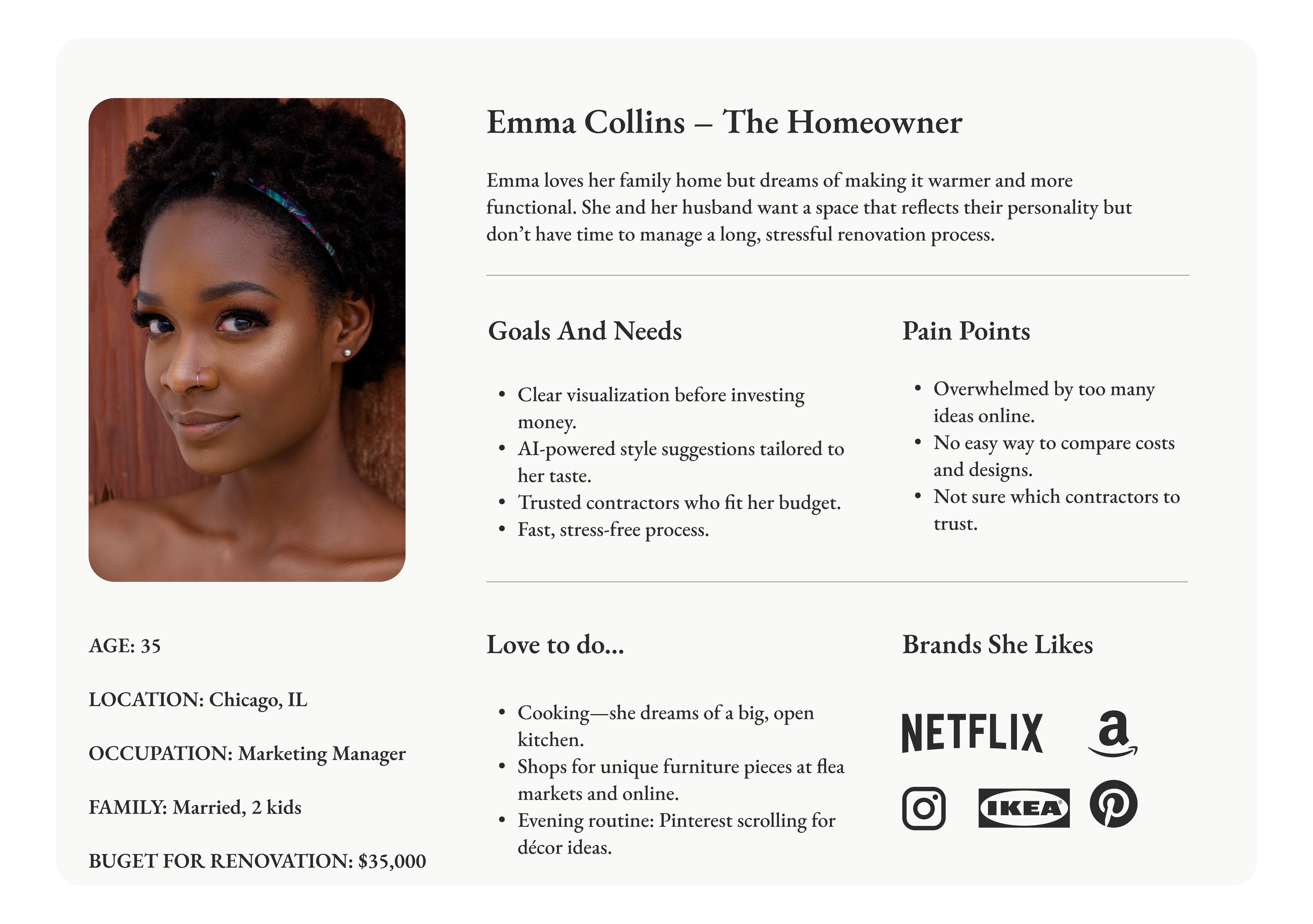 “I’m passionate about interior design, but I don’t have the time to manage a full renovation. Pinterest gives me ideas, but it ends there. If AI could turn my inspiration into a real plan and connect me with a contractor, I’d use today.”