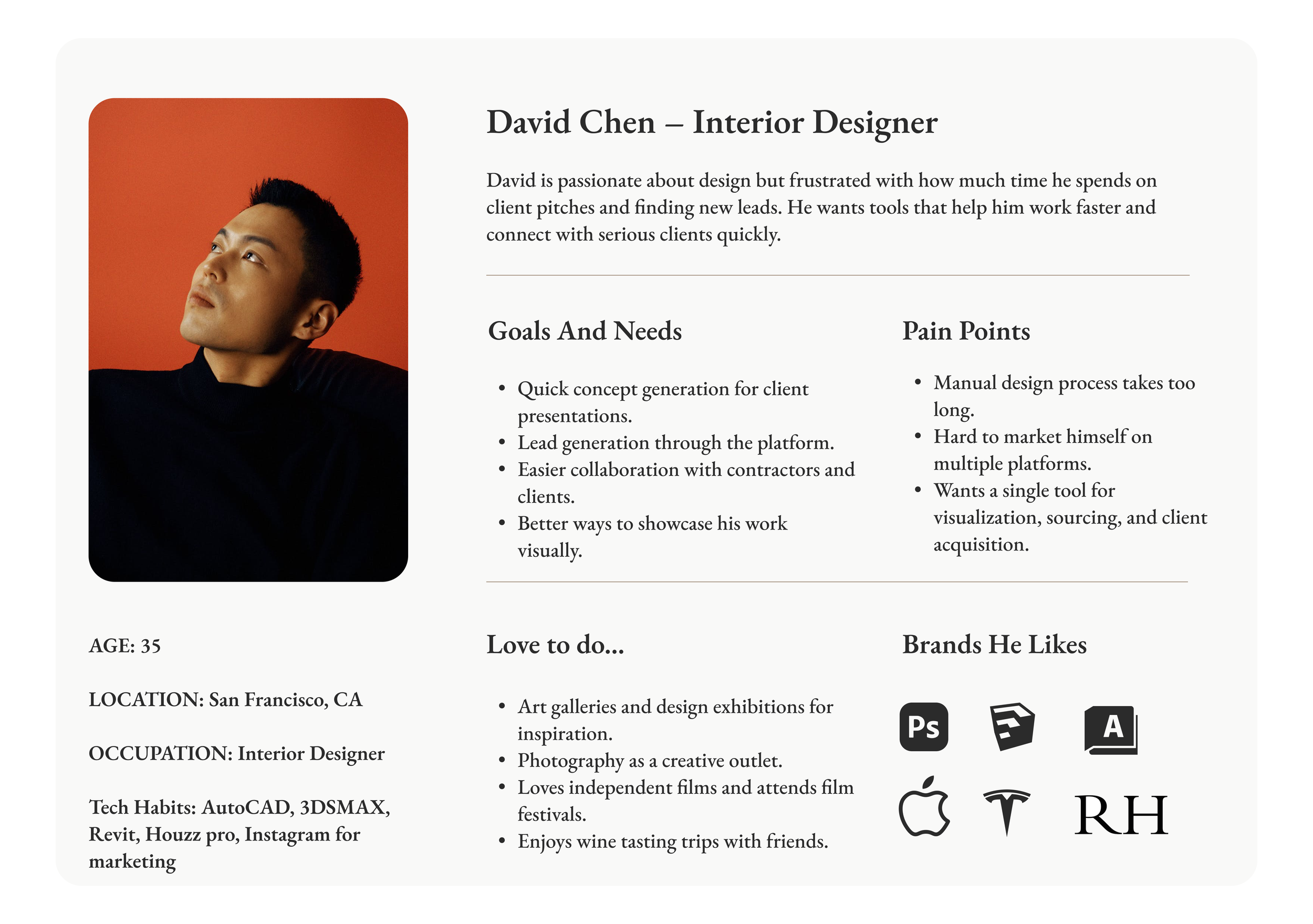 Interior Designers like myself (6 years ago) spending hours creating mood boards and 3D concepts just to give clients a rough idea—work that often wasn’t paid for and took valuable time away from real projects.