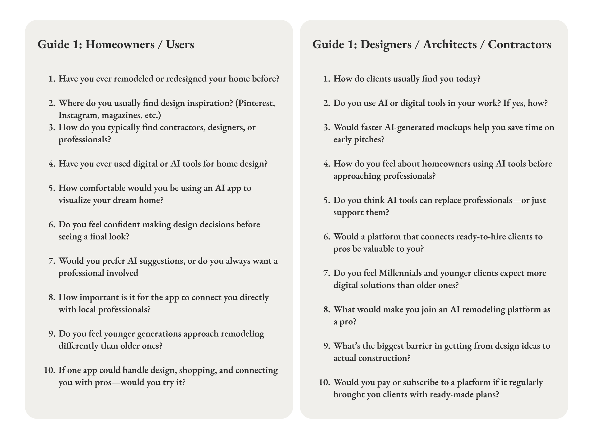 We’ll have two interview guides—one for homeowners/users and one for designers/architects/professionals—with 10 questions total, sample answers reflecting different age groups (based on the secondary research) , and sentiment around AI tools and connecting users with professionals.